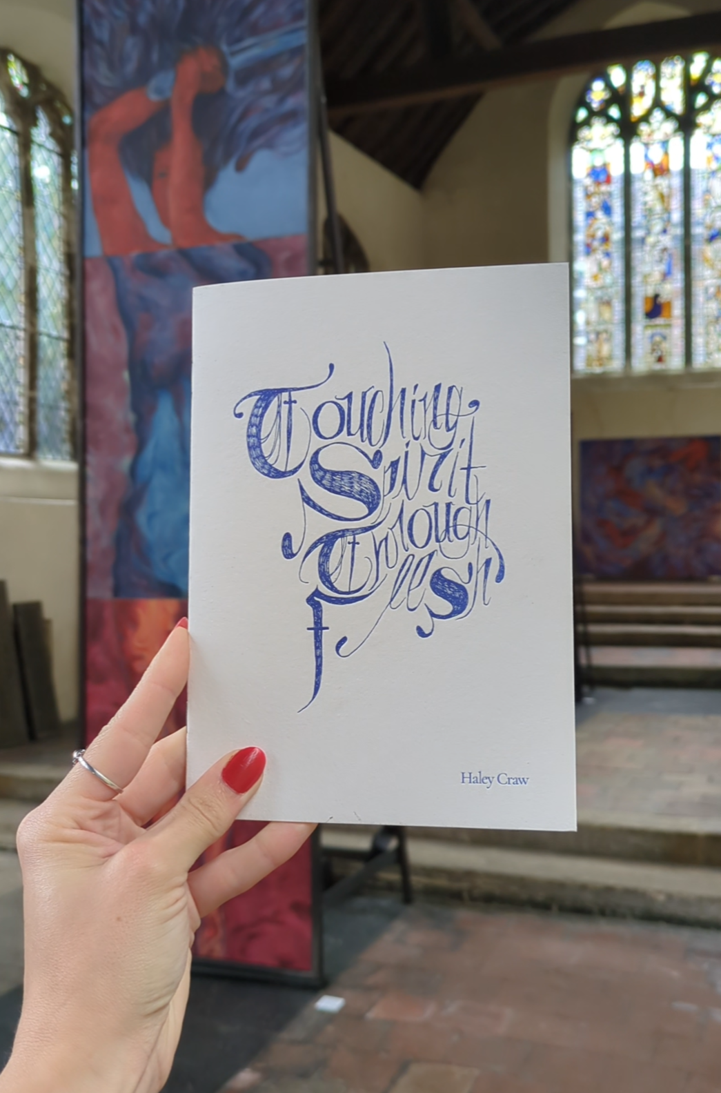 This exhibition text was included in the limited release publication Touching Spirit Through Flesh which accompanied the exhibition. Printed by Rizzo Studio in Norwich, letterpress and risograph printed.